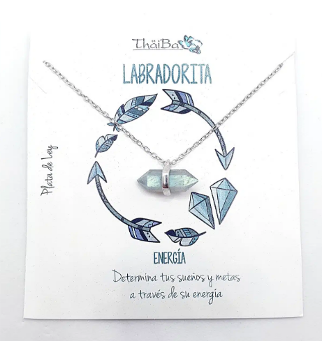 Collar piedra natural labradorita, en forma de prisma, indicada para la energía y metas. Plata de ley con cadena extensible a varias medidas.