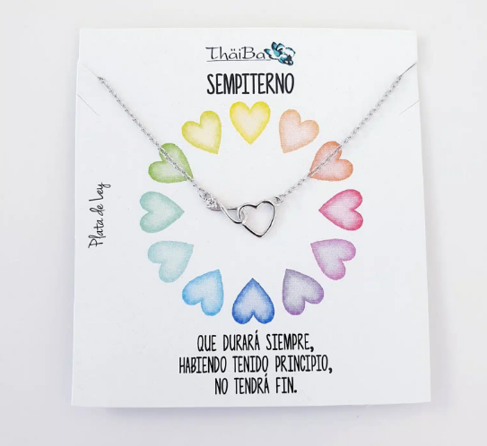 Collar con infinito y corazón entrelazados, simbolizando lo sempiterno, que durará siempre. Plata de ley con cadena extensible.