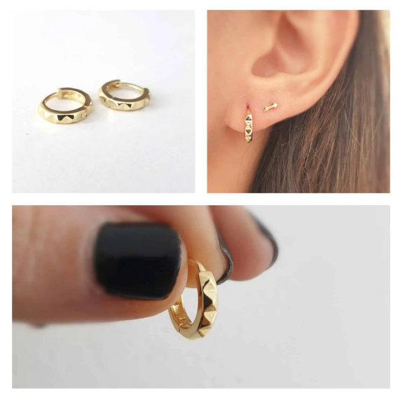 Pendientes aritos tachuelas en plata de ley con baño de oro de 14 quilates.